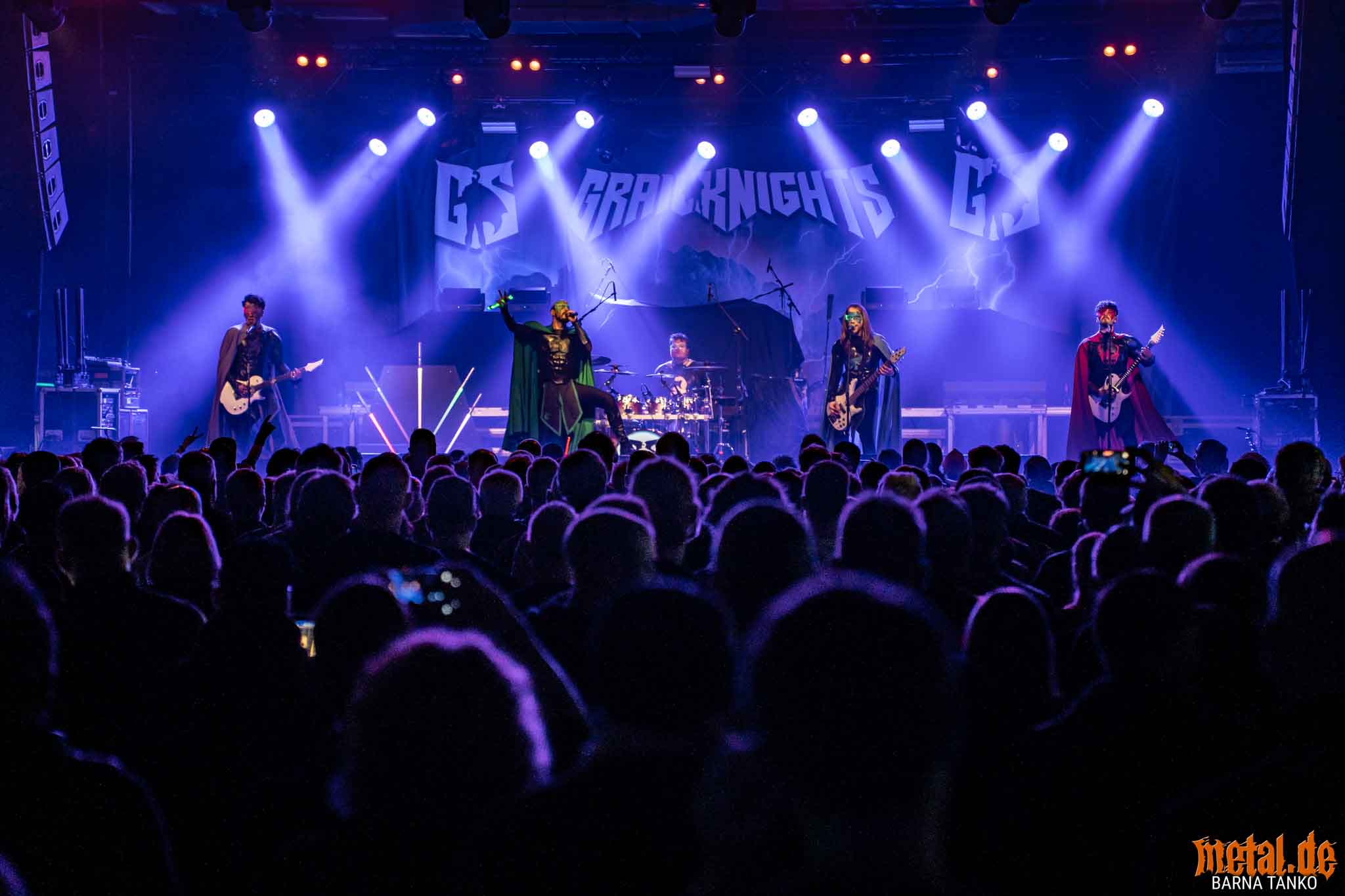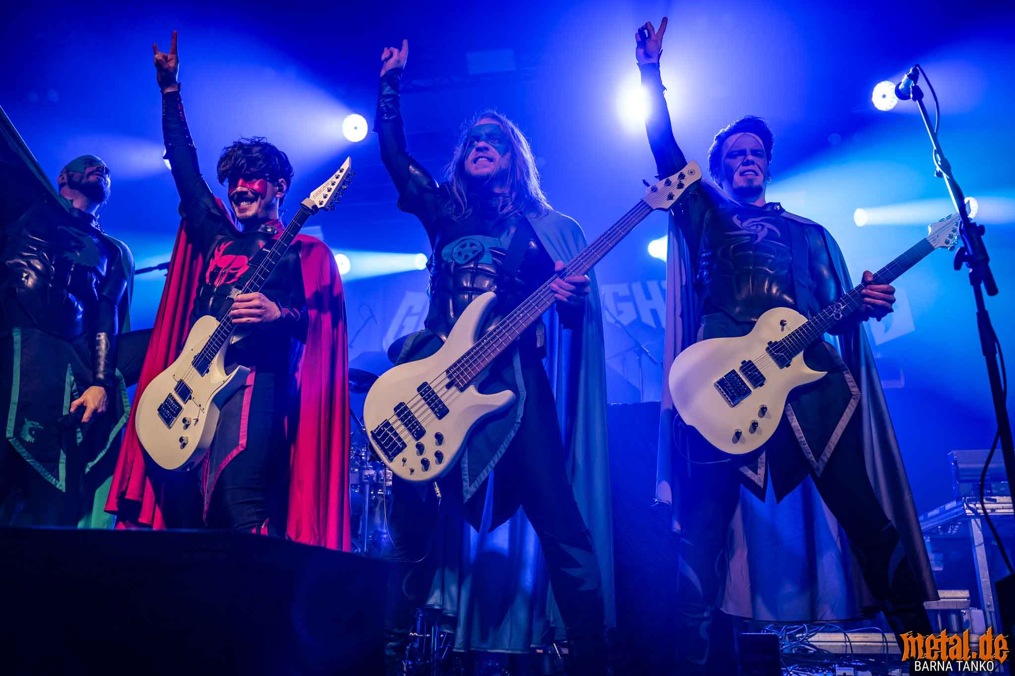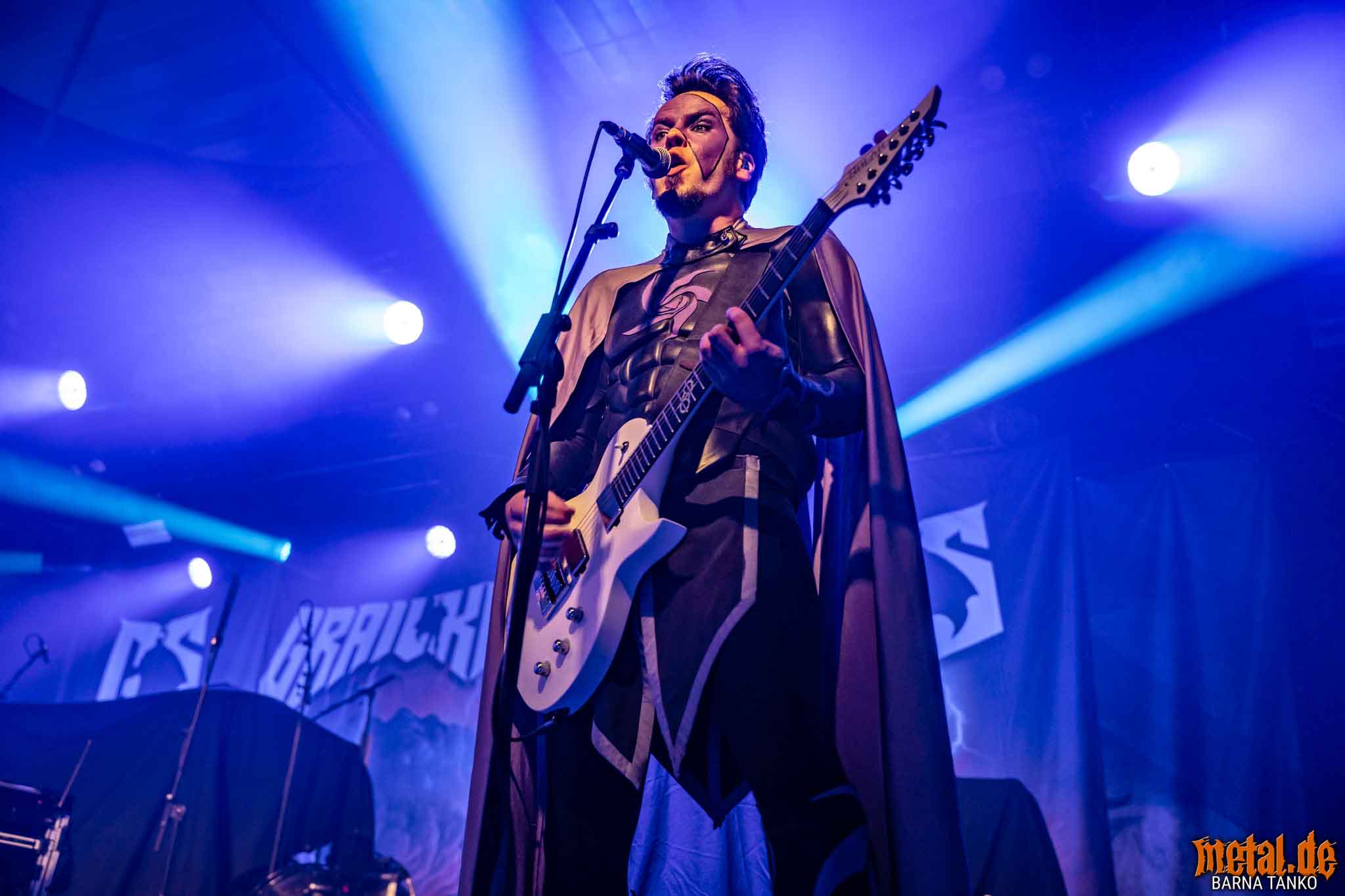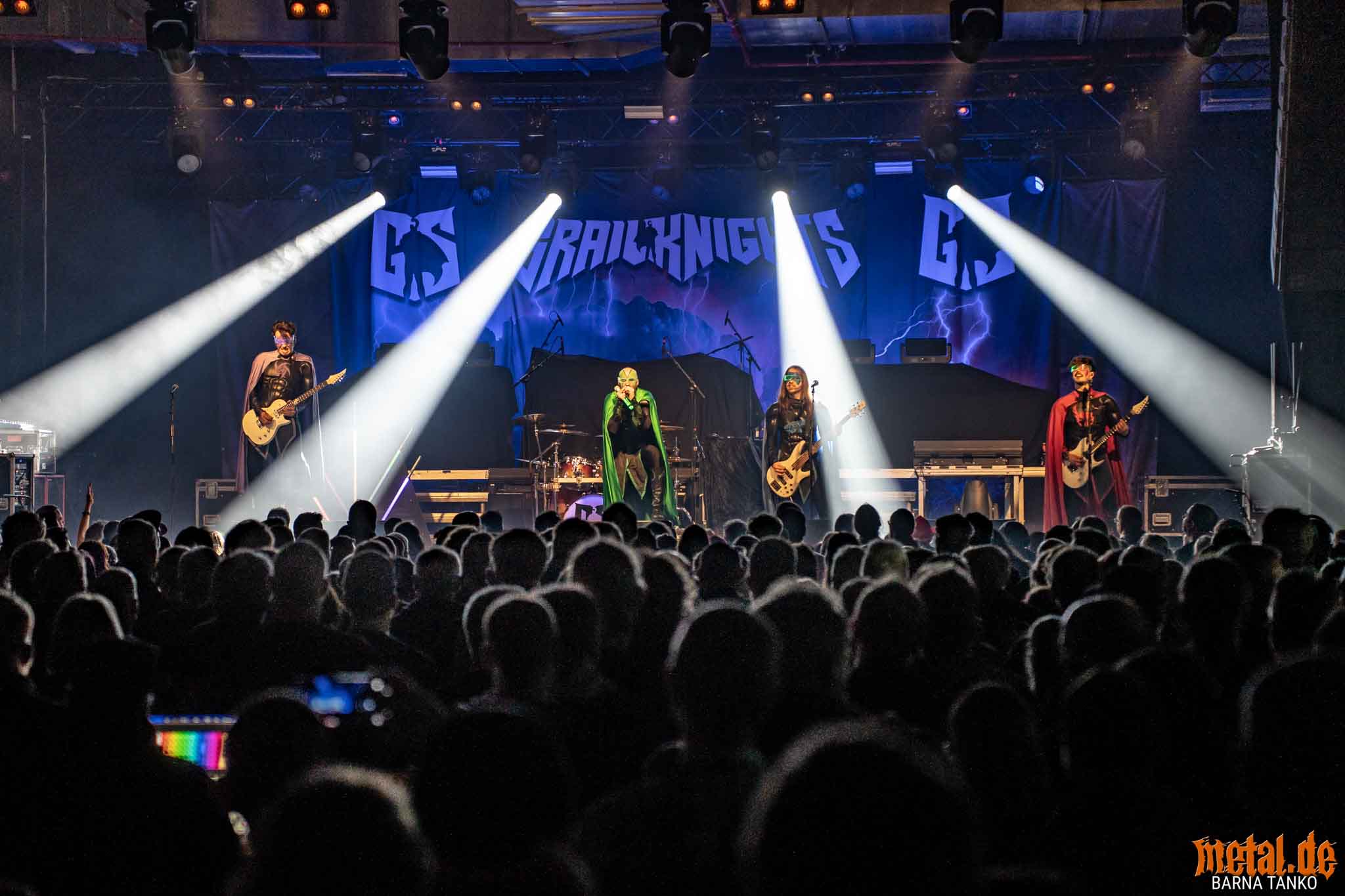 The Grailknights are a metal band from Hanover. Their music can be stylistically assigned to the melodic Death Metal and Power Metal. Their live performances include a strongly theatrical component that thrives on the interaction between the band and the audience. The eternal struggle of good against evil is the core of the band’s concept, which is fundamentally reminiscent of that of the Masters of the Universe. Thus, the Knights carry out their eternal battles against Dr. Skull of Castle Grailskull, their home castle in Grailham City. They themselves appear in superhero costumes or “Superhero armor” on, including painted face mask as a parody of Corpsepaint. In contrast to black metal, black and white colours do not dominate the painting and clothing of the Grailknights, but black and an individual colour for each member of the band. Due to their superhero costumes and self-deprecating appearance, the band stands out strongly from the otherwise rather dark heavy metal. The concerts are humorously staged as epic battles. Most of the time Dr. Skull has stolen the holy Grail of the Grail Knights and in the course of the concert it is recaptured by the band. Various supporting characters for both sides appear on stage. The audience, referred to by the band as the Battlechoir, is actively integrated into the battle through cheering speeches, smaller stories and gags. The battle cry is: “Grailknights Battlechoir”, and the audience replies in chorus: “Yes Sire!”.