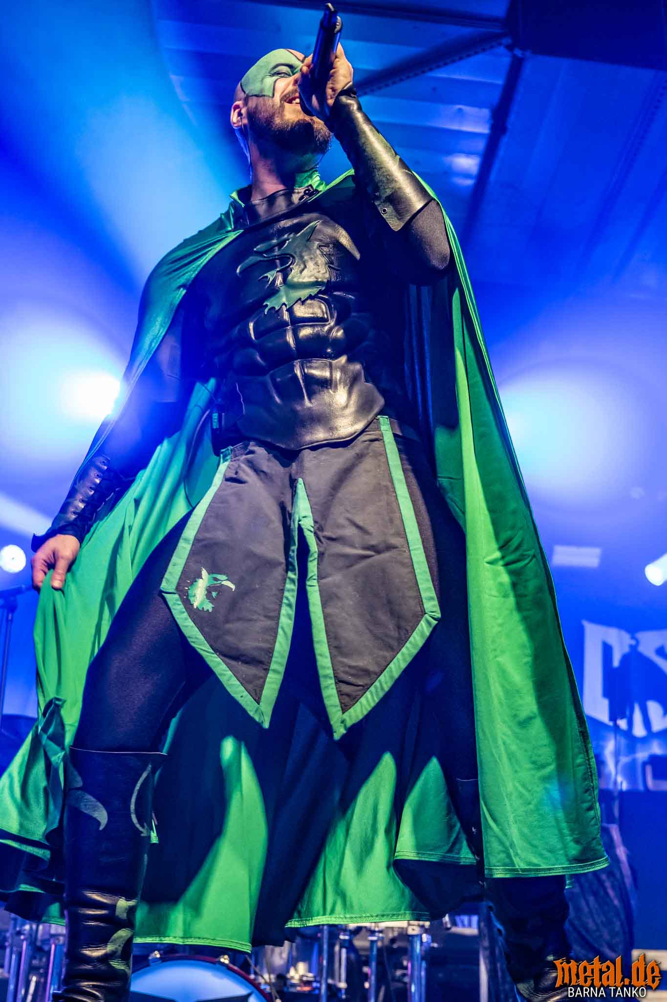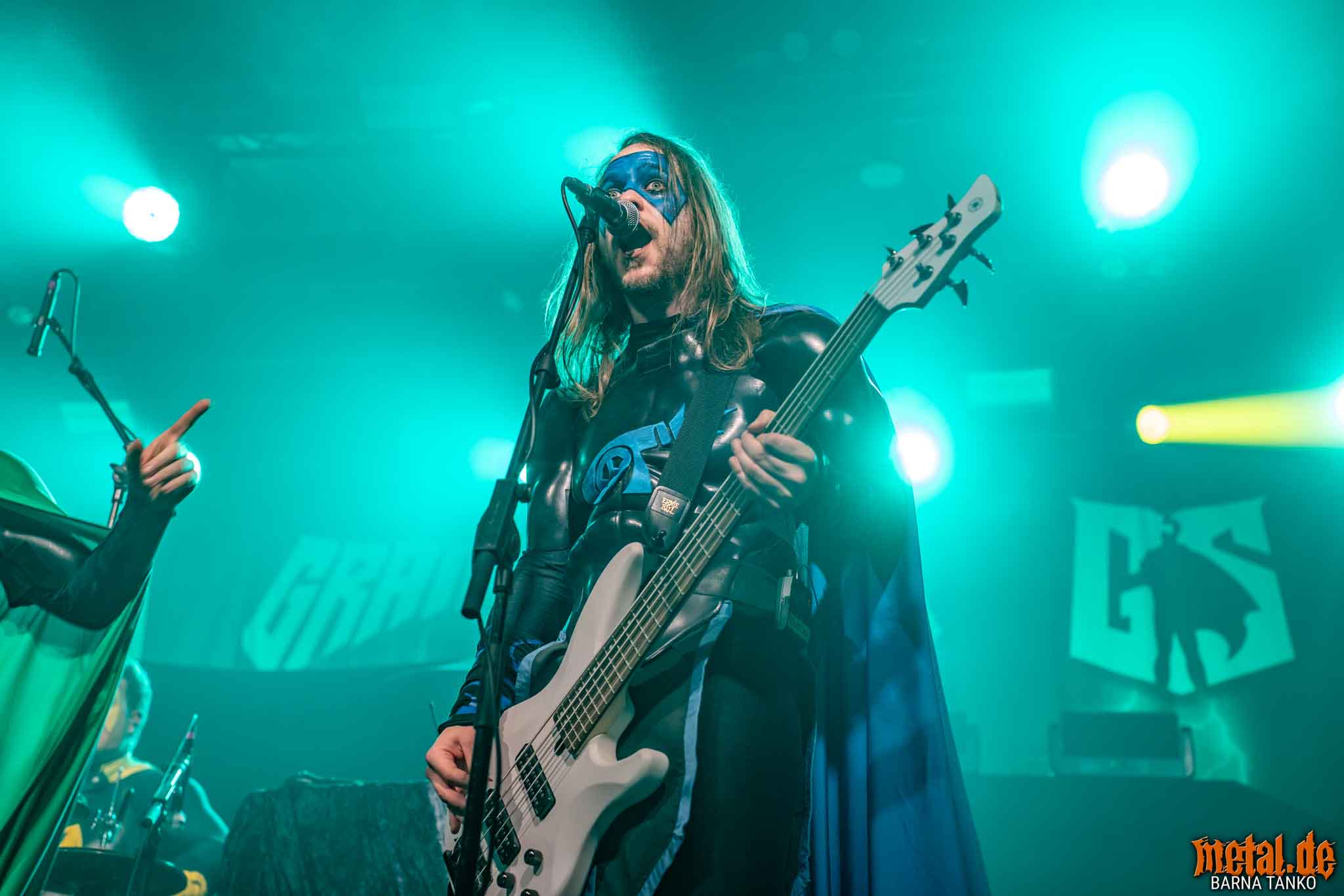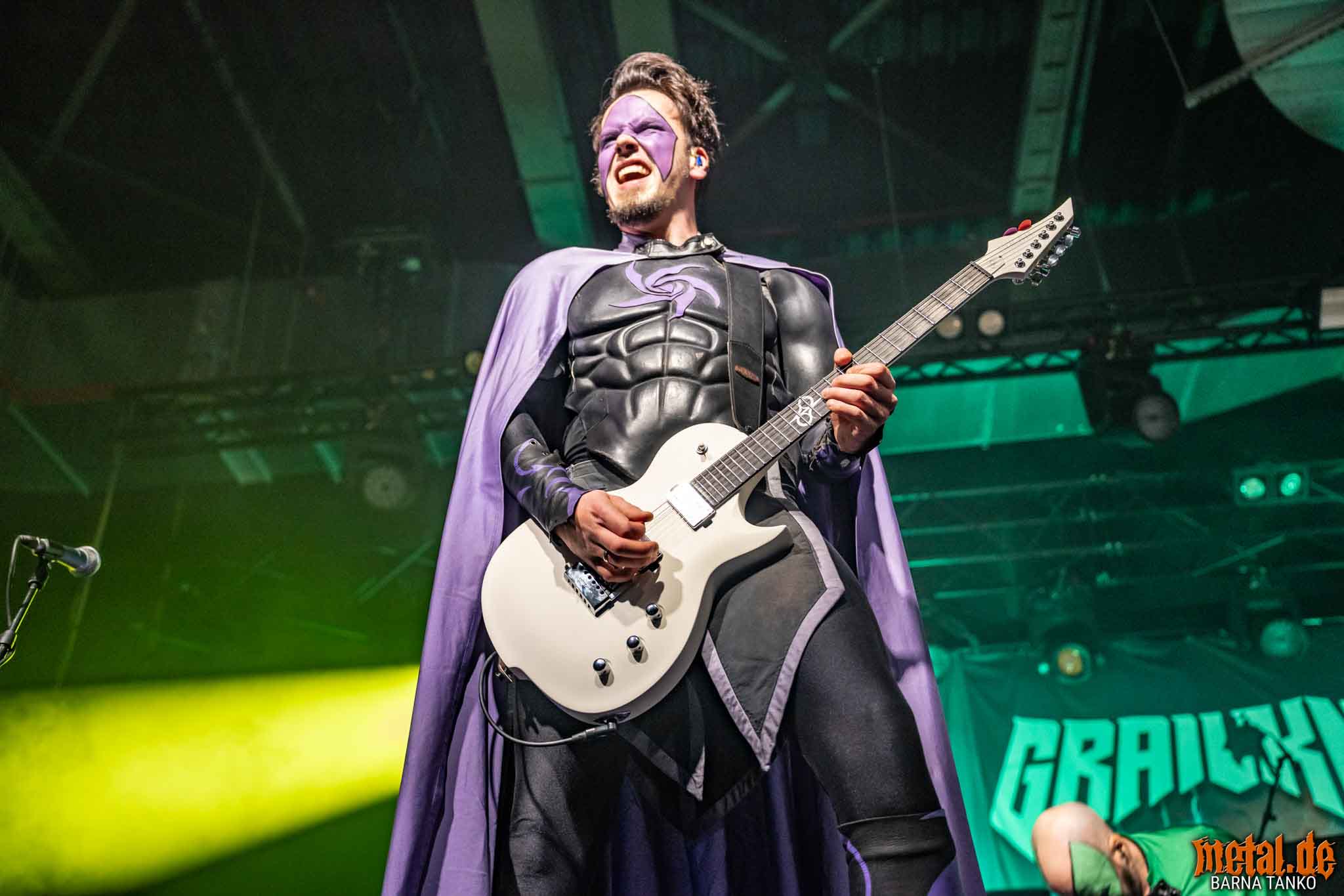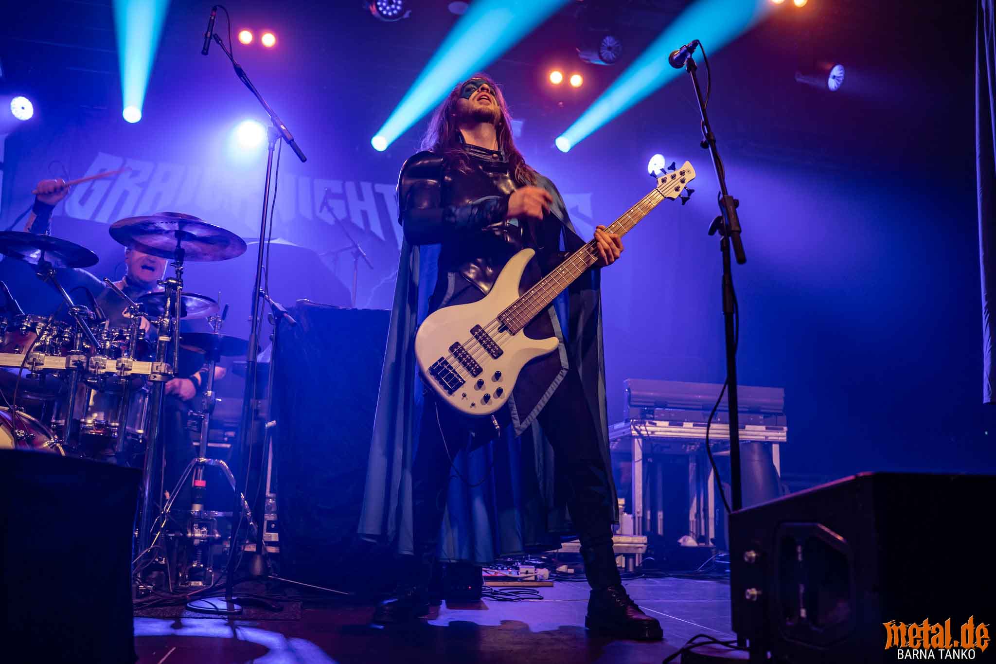 The Grailknights are a metal band from Hanover. Their music can be stylistically assigned to the melodic Death Metal and Power Metal. Their live performances include a strongly theatrical component that thrives on the interaction between the band and the audience. The eternal struggle of good against evil is the core of the band’s concept, which is fundamentally reminiscent of that of the Masters of the Universe. Thus, the Knights carry out their eternal battles against Dr. Skull of Castle Grailskull, their home castle in Grailham City. They themselves appear in superhero costumes or “Superhero armor” on, including painted face mask as a parody of Corpsepaint. In contrast to black metal, black and white colours do not dominate the painting and clothing of the Grailknights, but black and an individual colour for each member of the band. Due to their superhero costumes and self-deprecating appearance, the band stands out strongly from the otherwise rather dark heavy metal. The concerts are humorously staged as epic battles. Most of the time Dr. Skull has stolen the holy Grail of the Grail Knights and in the course of the concert it is recaptured by the band. Various supporting characters for both sides appear on stage. The audience, referred to by the band as the Battlechoir, is actively integrated into the battle through cheering speeches, smaller stories and gags. The battle cry is: “Grailknights Battlechoir”, and the audience replies in chorus: “Yes Sire!”.