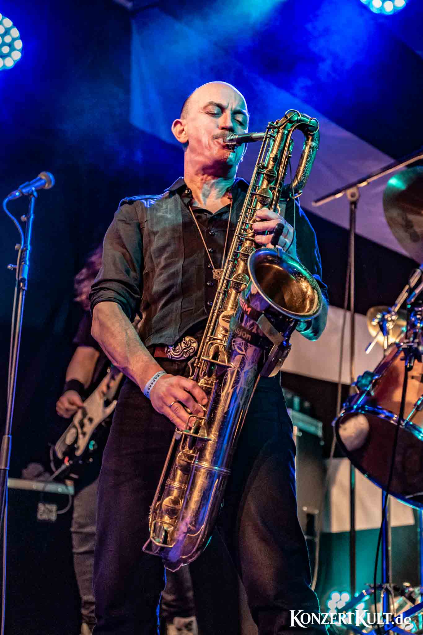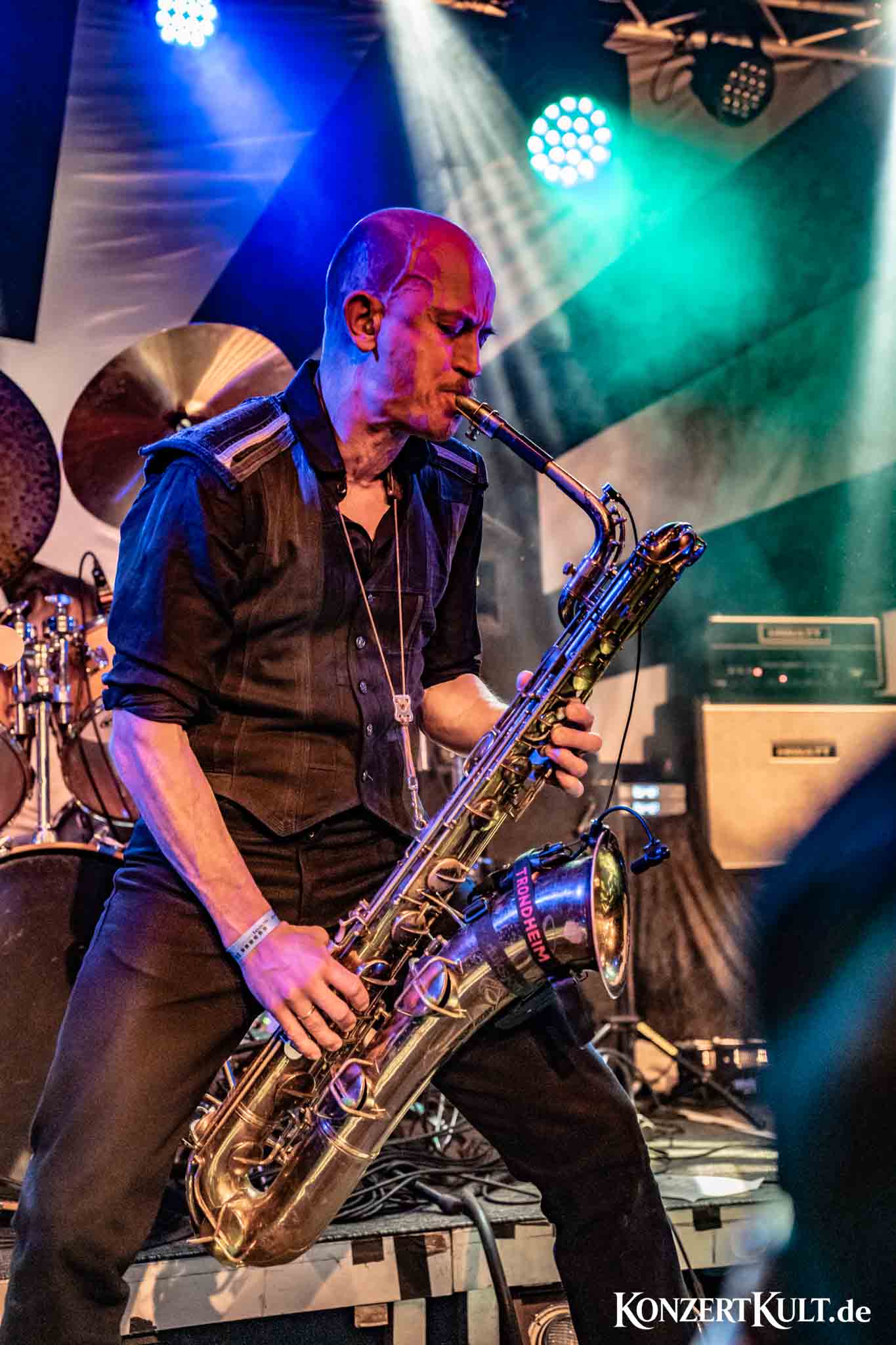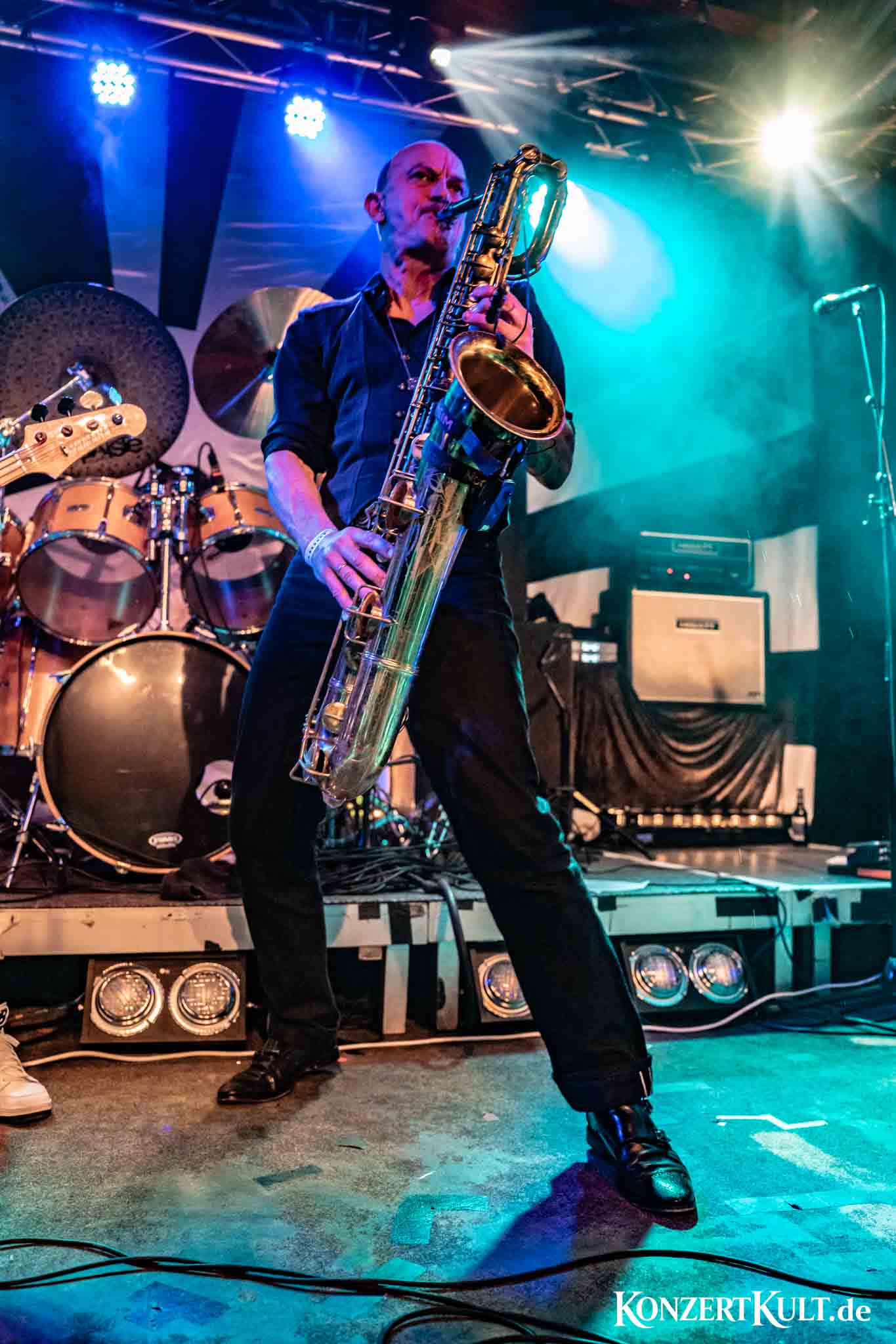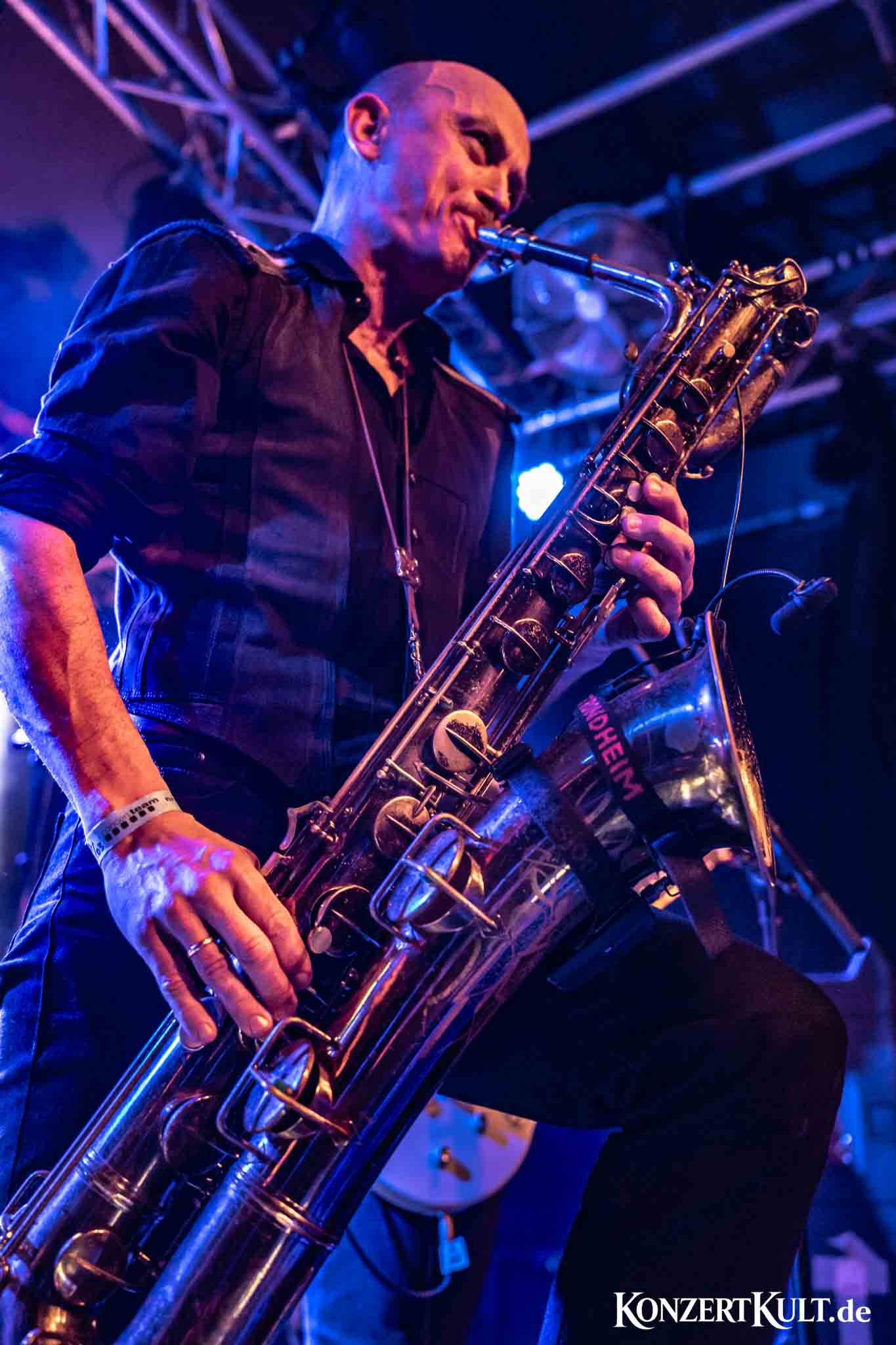 The stage setup leaves little doubt about where the band’s rhythmic core lies. A drum kit far larger than average dominates the stage, signalling the importance of the band’s powerhouse percussion, although we have not seen much the man in command buried behind the set. Around it, Spidergawd build their sound with driving bass lines, gritty guitar riffs, layered vocal harmonies and, of course, the unmistakable presence of bass saxophone.
